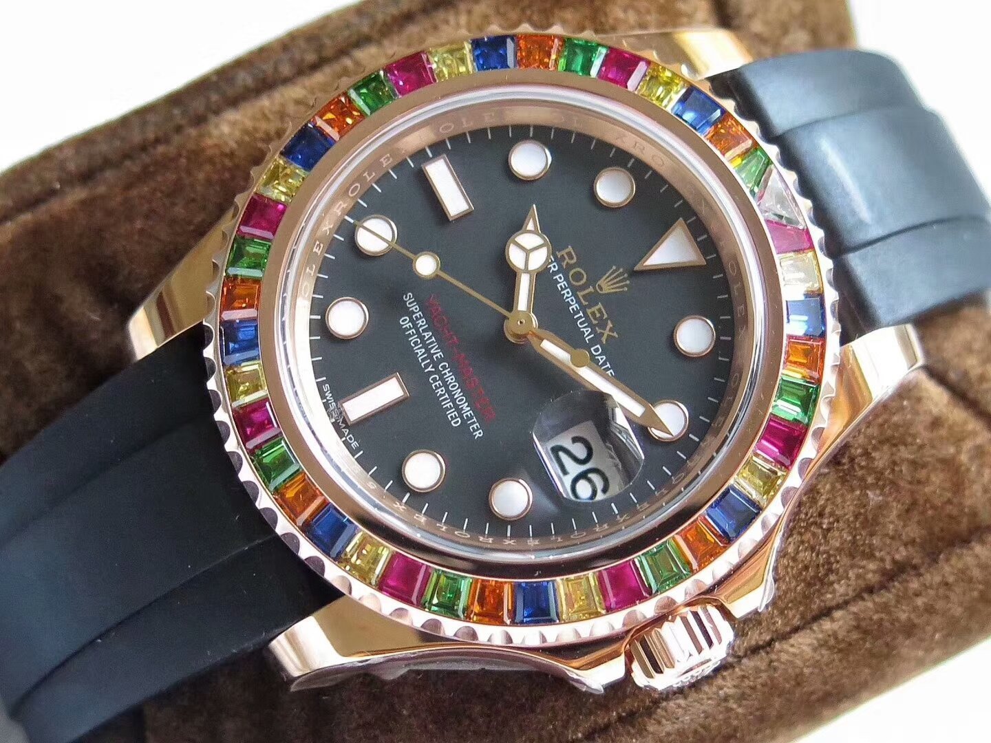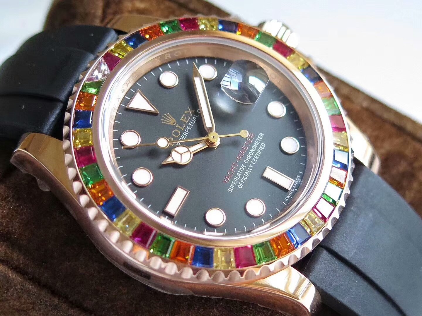 Двунаправленный, вращающийся позолоченный безель, инкрустированный по радиусу сапфирами и рубинами (при вращении безеля 120 щелчков). |
