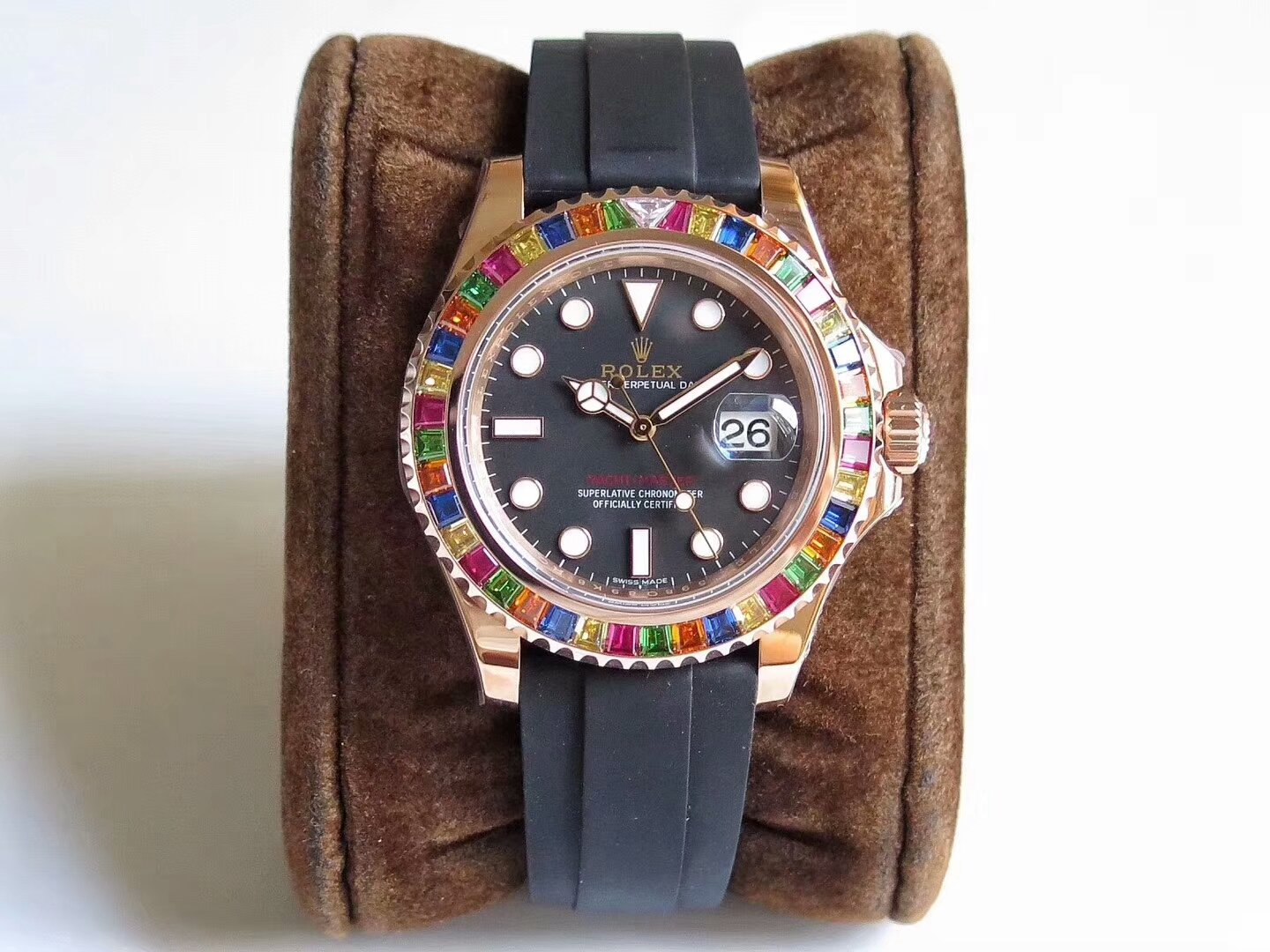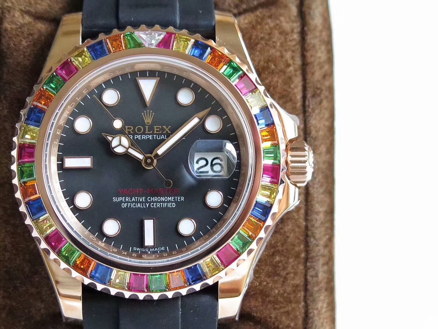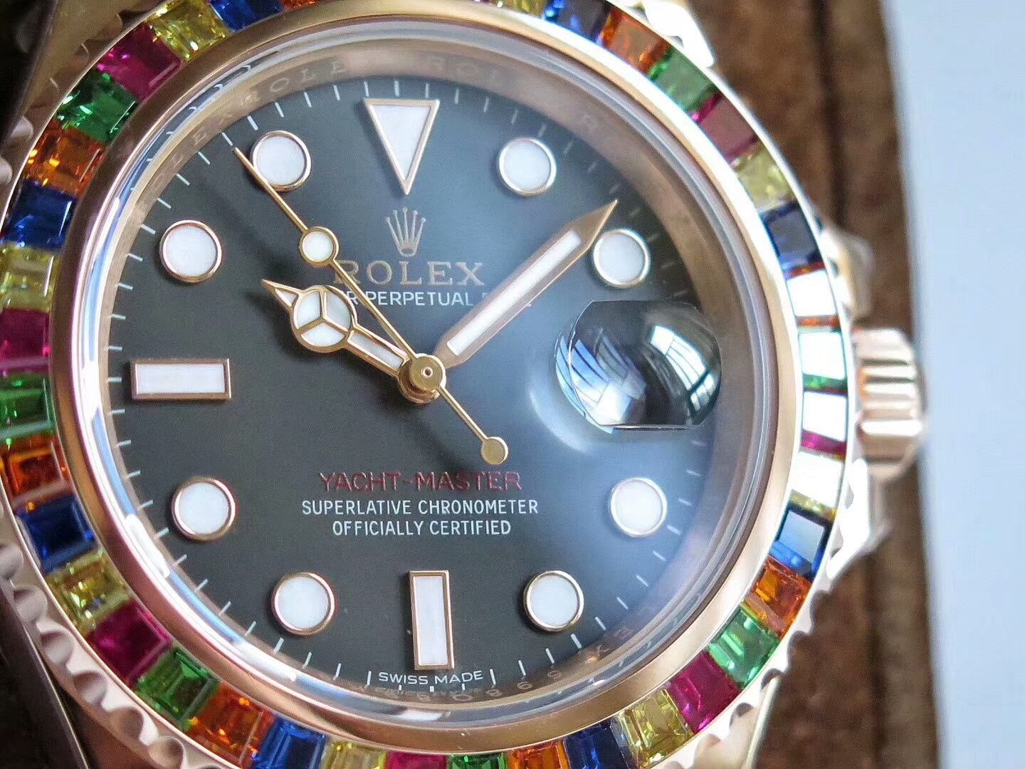 Сапфировое стекло, с просветляющим антибликовым покрытием на увеличительном циклопе и гравировкой коронки Rolex на стекле, в отметке на 18.00 часов; |